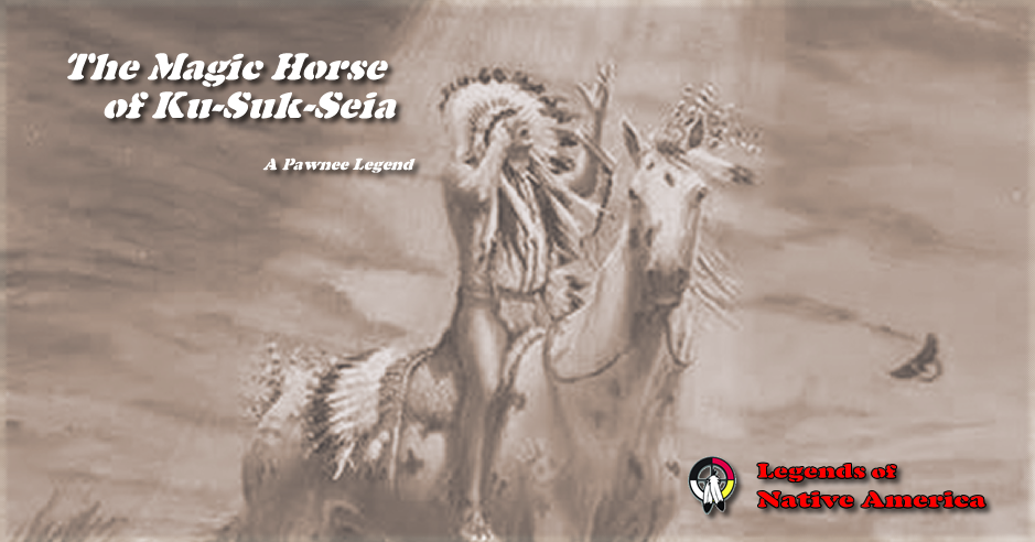 At last Ku-suk-seia died. The Pawnees intoned their death chants, wrapped their chief in the white bison skins and laid him on the litter of the dead. But when the warriors went to find his mount, to kill him on the alter of the dead so that he could go to the Happy Hunting Grounds with his master, the bay horse had disappeared.